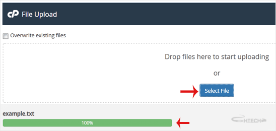 5. Click on Select File and choose the file you want to upload from your computer. Click open and the upload process will begin. You can also drag and drop files from your computer in the upload box.